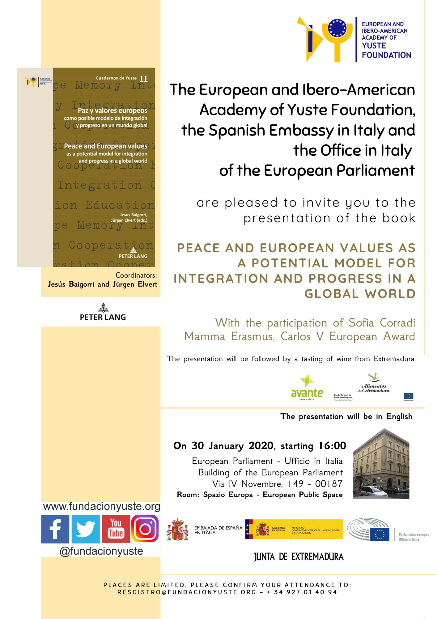 PRESENTATION OF THE BOOK, PEACE AND EUROPEAN VALUES AS A POTENTIAL MODEL FOR INTEGRATION AND PROGRESS IN A GLOBAL WORLD + Add to Google Calendar + iCal / Outlook export The event is finished. Tags: 2020, 2020 Date Jan 30 2020 Expired! Time 4:00 pm Category ACTIVIDADES - Eng Presentaciones de libros - Eng Share this event
